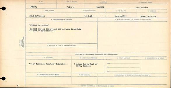 The life of Luc-Antoine Lamblin is an example of pride and family resiliency. He grew up in a rich family of seven children in Ronchin, France, and, following the father’s death, and a reversal of fortune, they lost the family estate. To rebuild a better future, the mother immigrated from France to Canada, with the eldest daughter (Marie-Estelle) and two sons (Antoine and Luc). They arrived in Québec on 23 June 1910, heading toward Manitoba. Three years later, another son (Robert) joined them, with his wife and children. The three brothers applied on the Dominion Lands Manitoba Homestead Grant for settlement in Western Canada, with the intent of farming. The war changed their plans and Luc died in service. His land grant was approved in 1918, four months after he died.