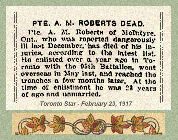 Son of H. T. and Annie Roberts, of 32, Skipper Avenue, Toronto, Ontario. Born at McIntyre, Ontario.