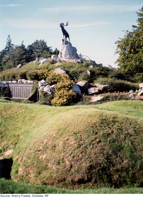 In BEAUMONT HAMEL MEMORIAL PARK, which was officially opened by Earl Haig on June 7, 1925, the monument of the great bronze caribou, emblem of the Royal Newfoundland Regiment, stands on the highest point overlooking St John's Road and the slopes beyond. At the base of the statue three tablets of bronze carry the names of over 800 members of the Royal Newfoundland Regiment, the Newfoundland Royal Naval Reserve, and the Mercantile Marine who gave their lives in the First World War and have no known grave. In the lodge, which houses the reception room for visitors to the Park, a bronze plaque, unveiled in 1961 by the Hon. Joseph Smallwood, Premier of Newfoundland, lists the Battle Honours won by the Royal Newfoundland Regiment and pays tribute to its fallen.