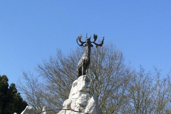 In BEAUMONT HAMEL MEMORIAL PARK, which was officially opened by Earl Haig on June 7, 1925, the monument of the great bronze caribou, emblem of the Royal Newfoundland Regiment, stands on the highest point overlooking St John's Road and the slopes beyond. At the base of the statue three tablets of bronze carry the names of over 800 members of the Royal Newfoundland Regiment, the Newfoundland Royal Naval Reserve, and the Mercantile Marine who gave their lives in the First World War and have no known grave. In the lodge, which houses the reception room for visitors to the Park, a bronze plaque, unveiled in 1961 by the Hon. Joseph Smallwood, Premier of Newfoundland, lists the Battle Honours won by the Royal Newfoundland Regiment and pays tribute to its fallen.