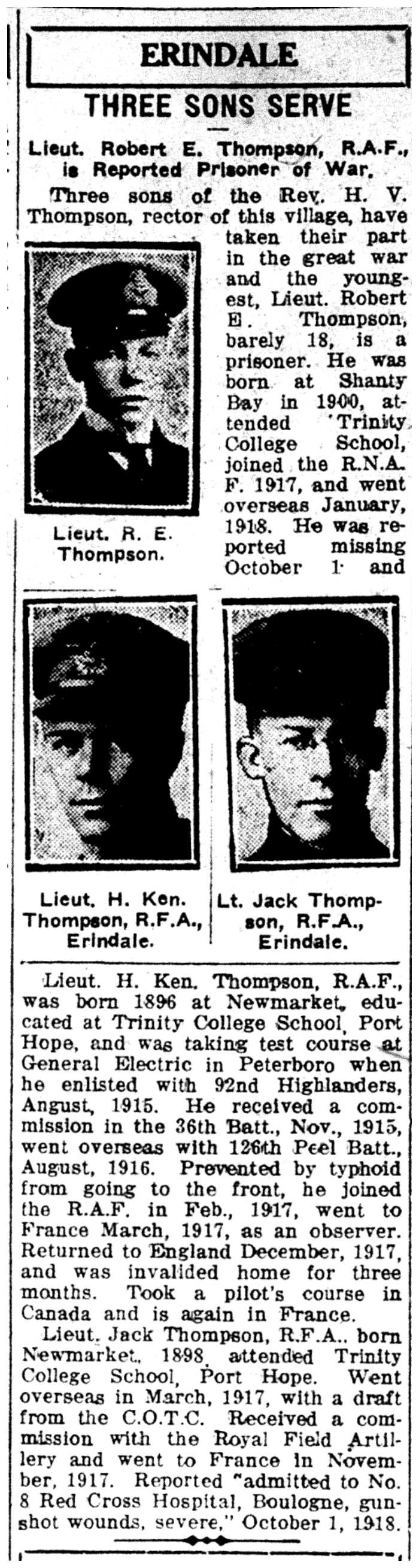 Son of the Rev. H. V. Thompson and Mrs. Thompson, of The Rectory, Erindale, Ontario. Educated at Trinity College School, Port Hope, Ontario.