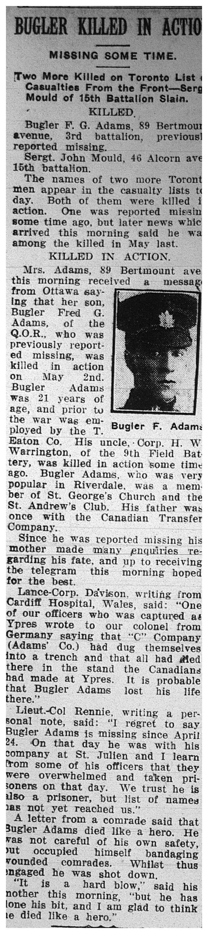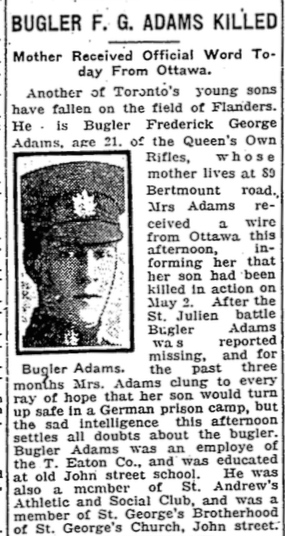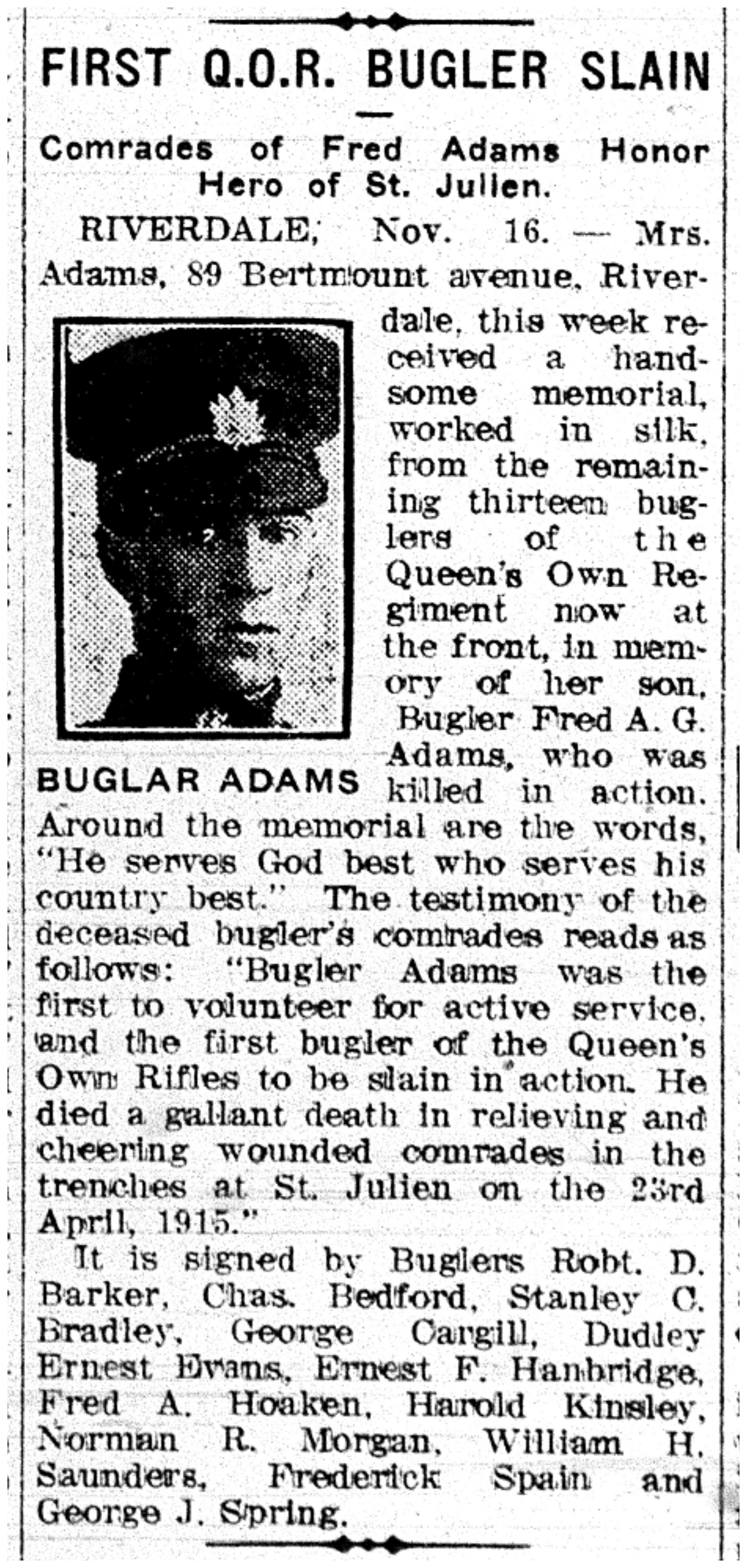 The dead are remembered to this day in a simple ceremony that takes place every evening at 8:00 p.m. All traffic through the gateway in either direction is halted, and two buglers (on special occasions four) move to the centre of the Hall and sound the Last Post. Two silver trumpets for use in the ceremony are a gift to the Ypres Last Post Committee by an officer of the Royal Canadian Artillery, who served with the 10th Battery, of St. Catharines, Ontario, in Ypres in April 1915."