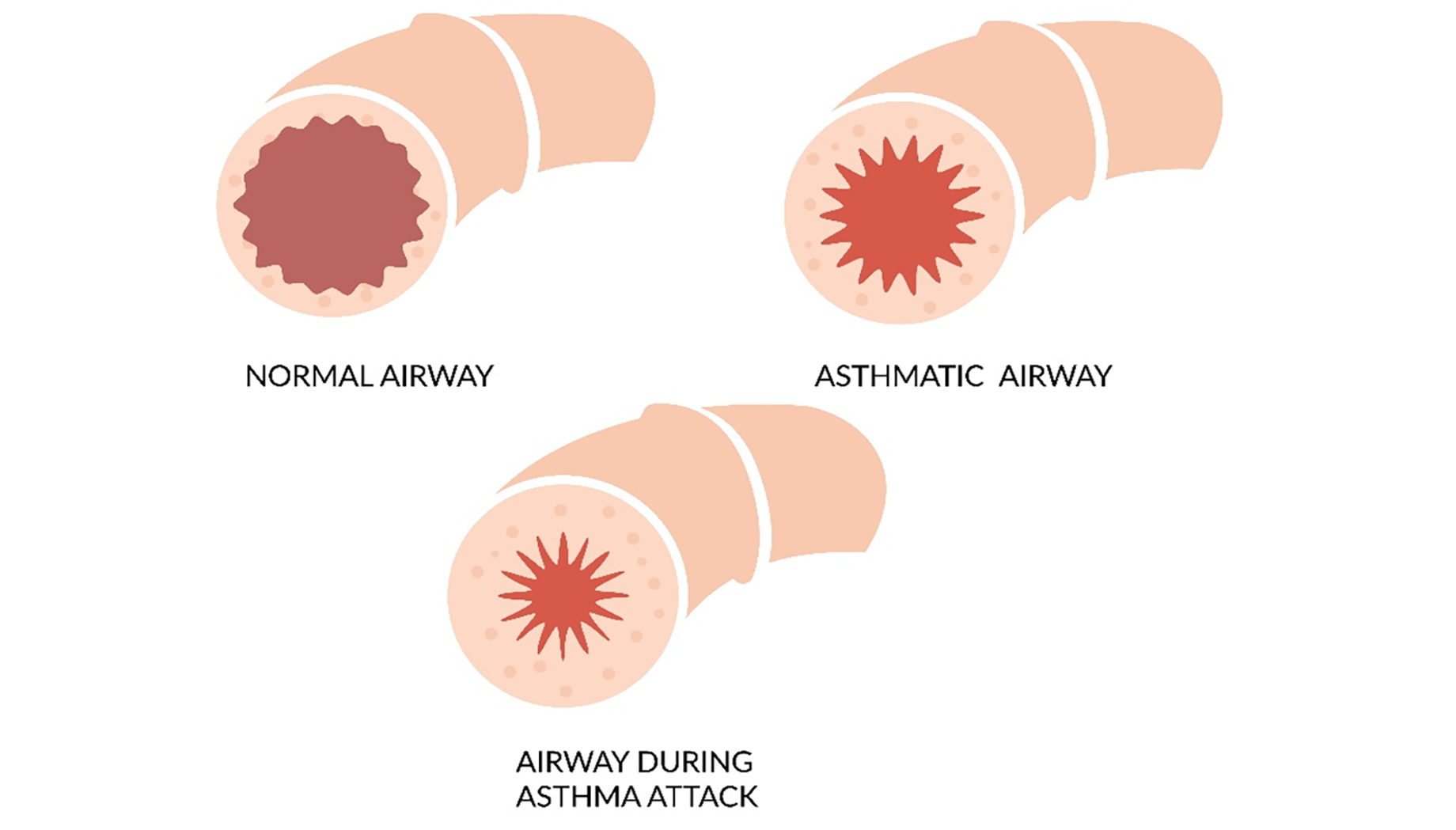 The airways and lungs in a person with asthma are hyperresponsive, meaning they react more strongly and easily than normal to various triggers. This hyperresponsiveness causes narrowing of the airways resulting in episodes of tightness, coughing, wheezing, and breathlessness (Figure 2: Airway patency). Inflammation leads to swelling and excess mucus production, further narrowing the airways. Over time, chronic inflammation can cause structural changes, known as airway remodeling, making the airways permanently narrower.
