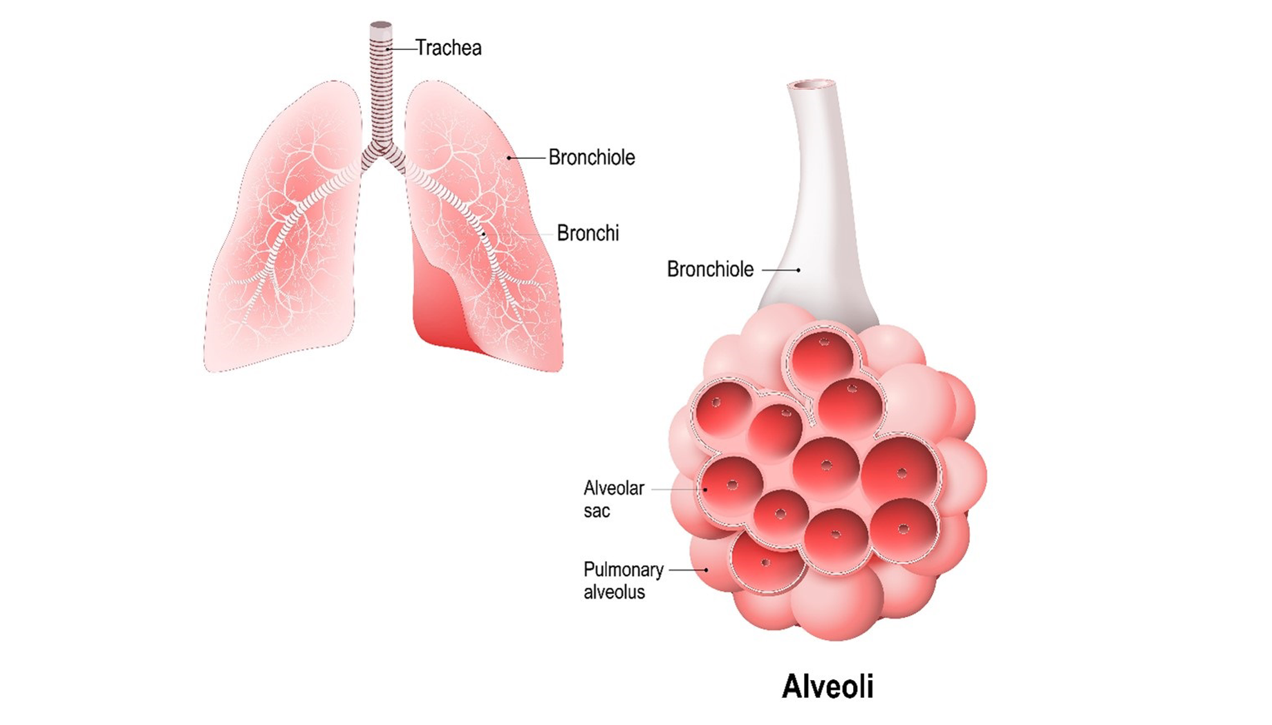 The left image illustrates the lungs and the trachea which branches into smaller tubes called bronchi and bronchioles. These structures carry air into and out of the lungs. The right image shows a close-up of a bronchiole connecting to alveoli – a cluster of air sacs where gas exchange occurs. An individual air sac, called a pulmonary alveolus, is enclosed within an alveolar sac. Source: Veterans Affairs Canada (2024).