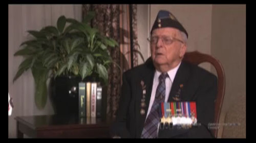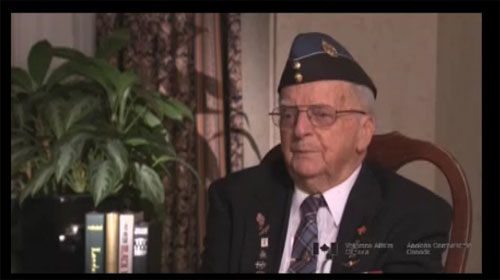 Mr. Warren's Spitfire is struck by shrapnel or ack-ack, leaving a hole in the cockpit and him with a numb leg. He jettisons his bombs and returns to base. Smelling something burning, his investigation finds a piece of molten metal in a tin box in his tunic pocket. During this clip, Mr. Warren also explains why Spitfire pilots seldom ejected if their plane was shot down.