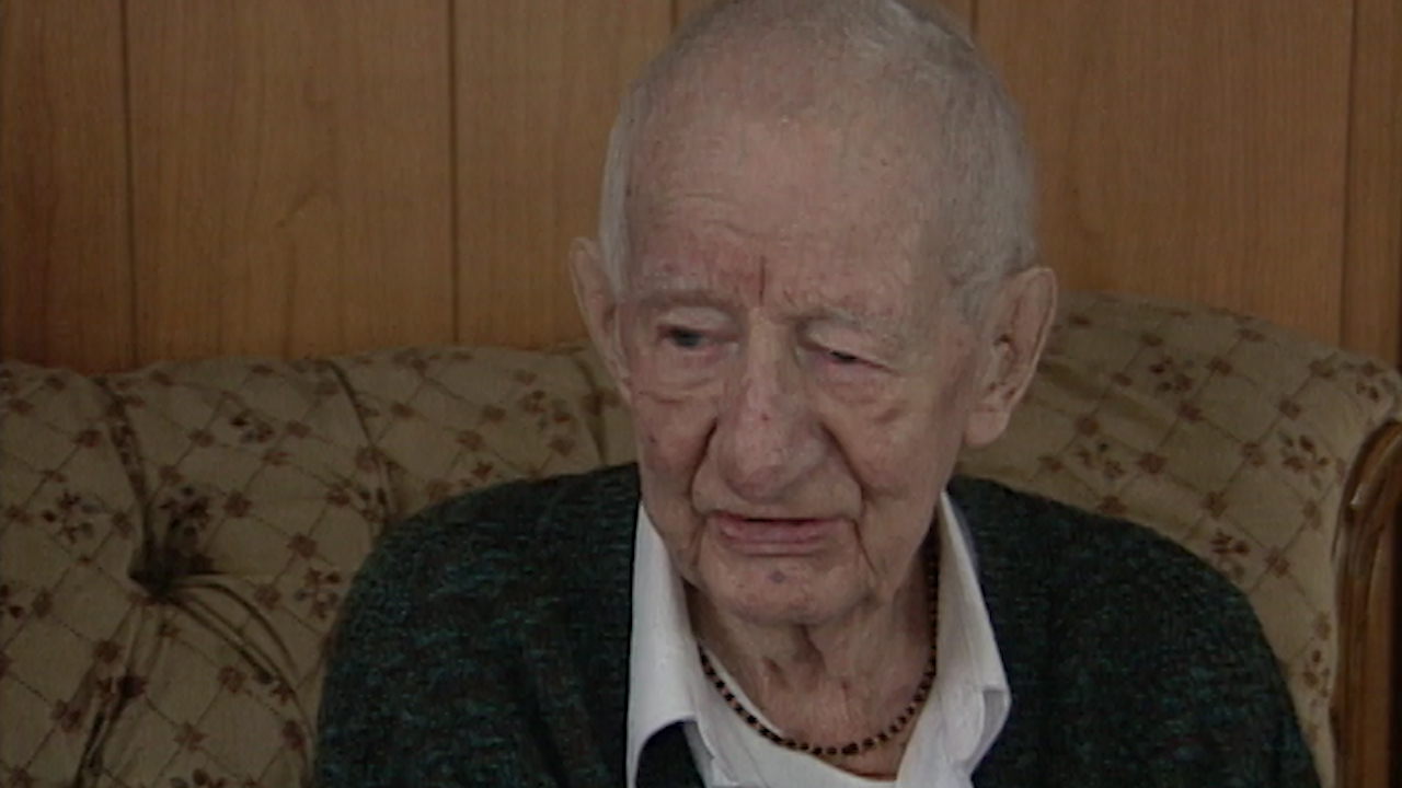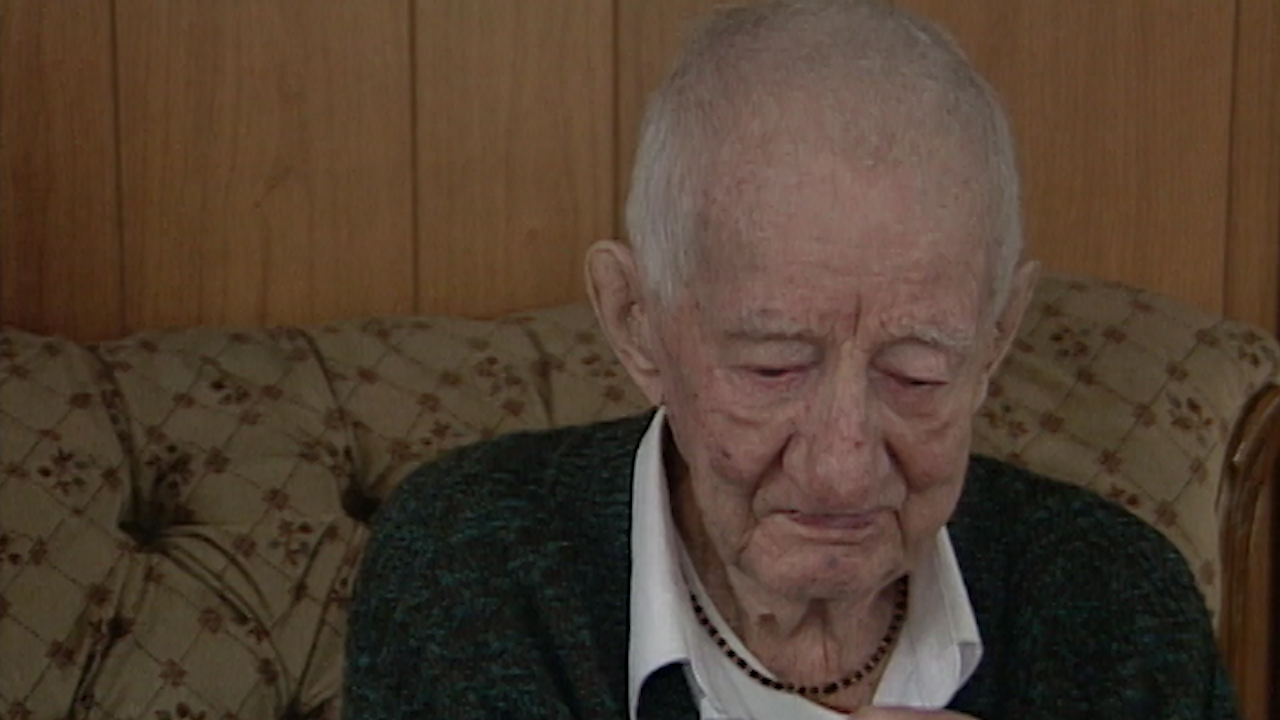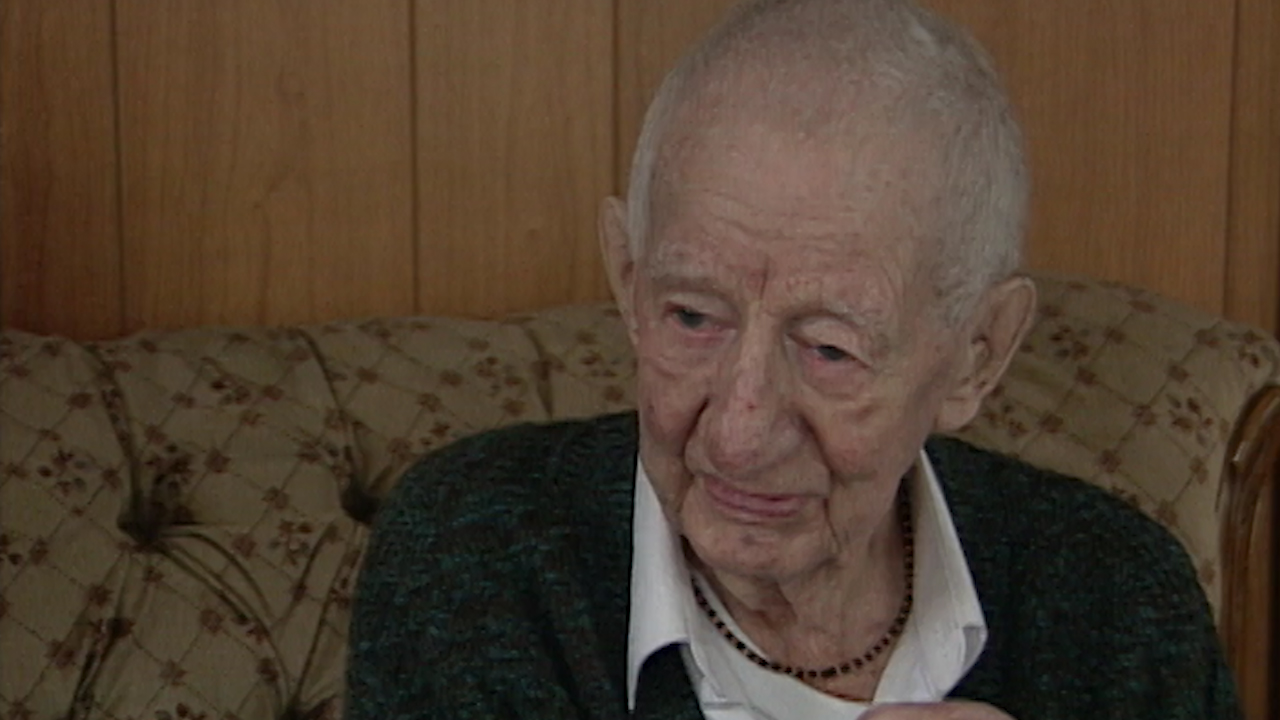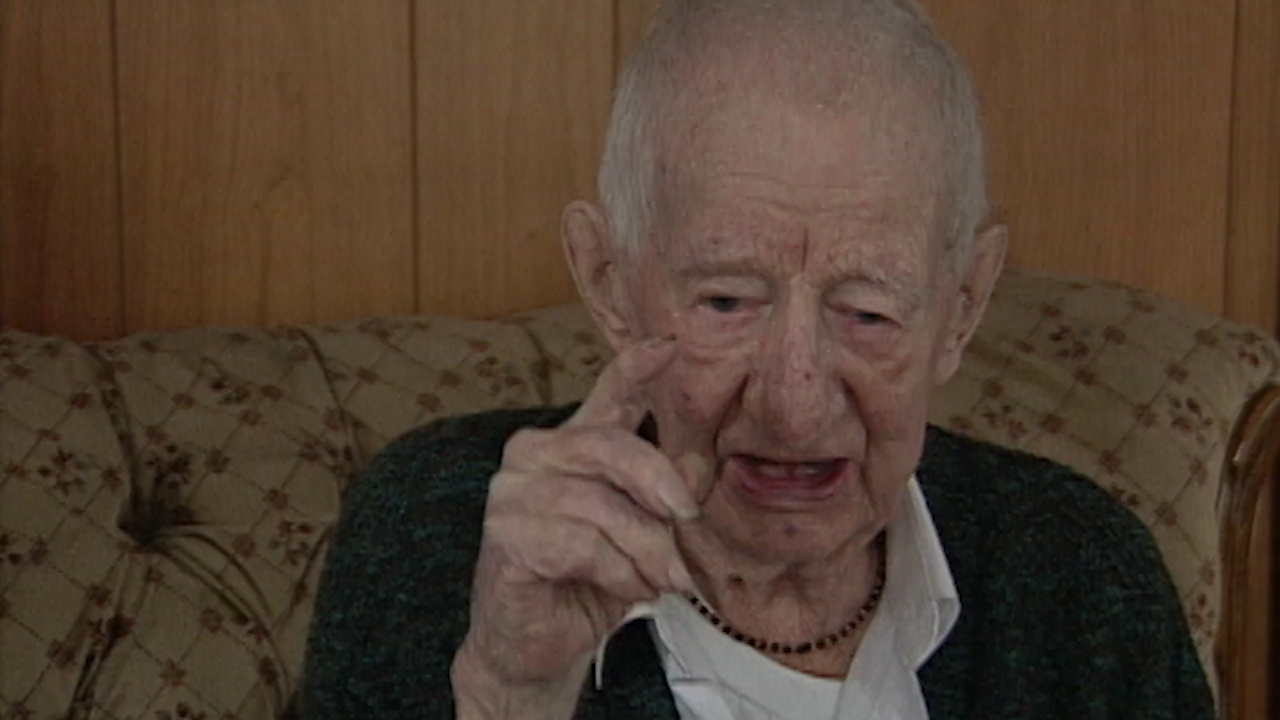 Mr. MacLeod describes how his entire battalion is strafed by a German machine gunner as they walk down a road, with only one man being hit in the heel.