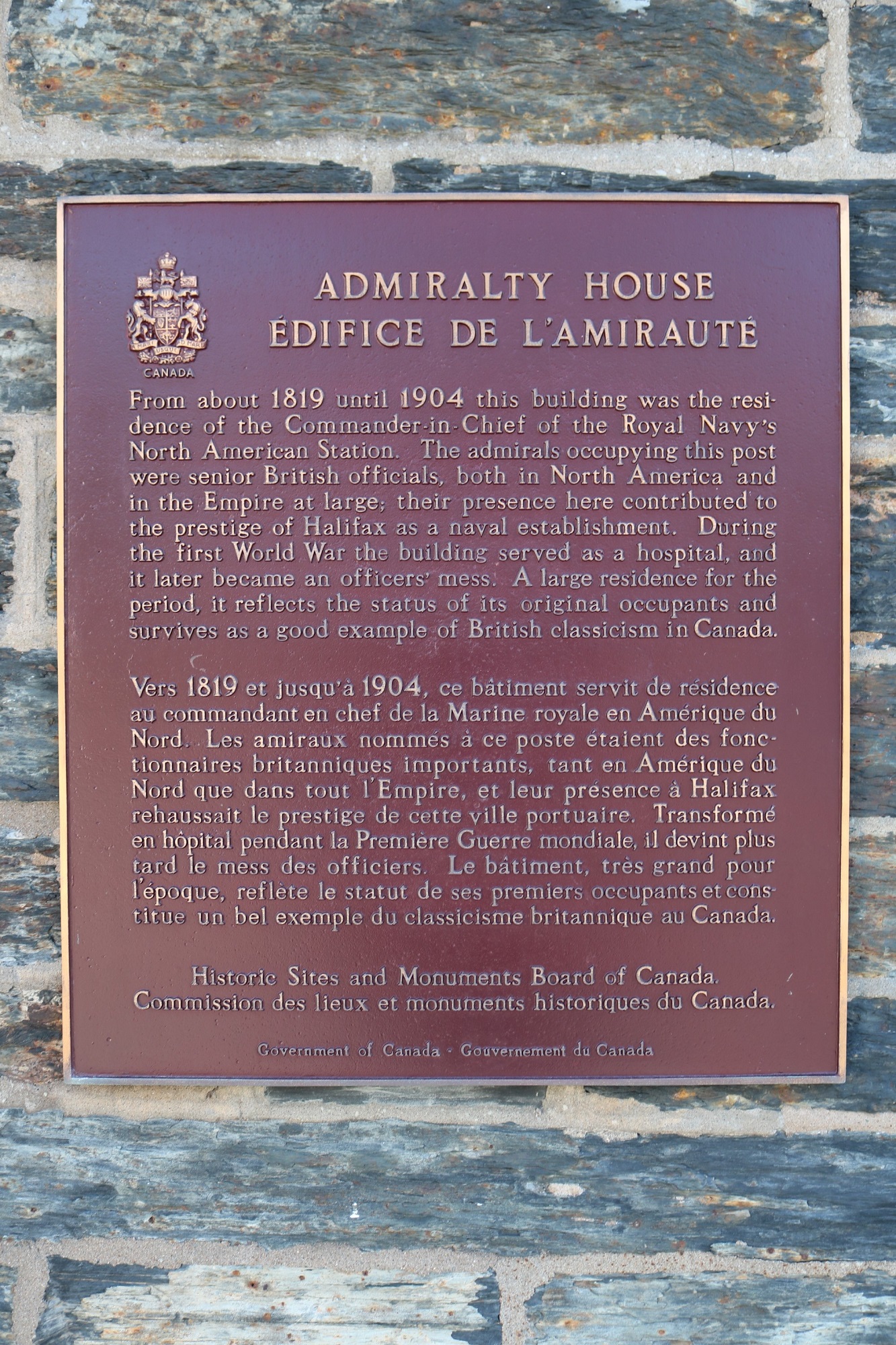 Admiralty House is the former official residence of the Commander-in-Chief of the North American Station of the Royal Navy. Construction of this Georgian-style home overlooking Halifax’s historic dockyard commenced in 1814 and was completed in 1818. The first resident was Admiral David Milne, followed by many notable residents such as Admiral Thomas Cochrane, Earl of Dundonald. On the grounds of the Admiralty House is the Admiralty Garden which was created c. 1814 and has plaques and monuments displayed to honour Admirals and other military personnel.