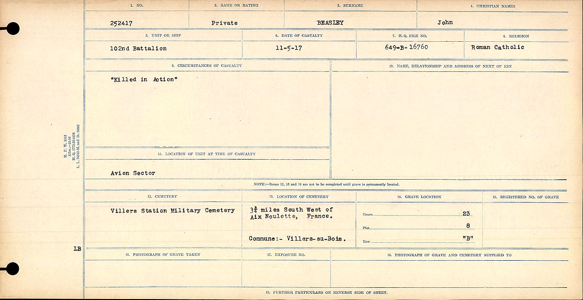 Villers-au-Bois is a village in the Department of the Pas-de-Calais, 11 kilometres north-west of Arras. The VILLERS STATION CEMETERY is about 2 kilometres north-west of the village.