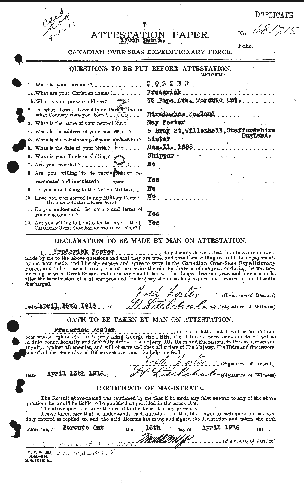 Digital gallery of Private Frederick Foster