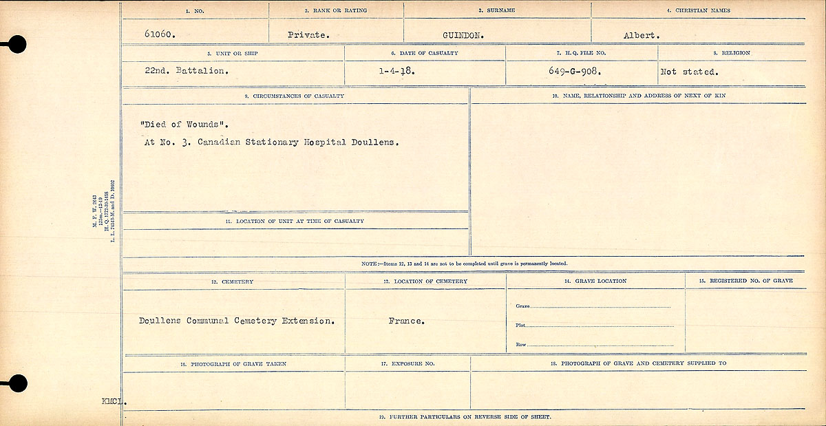 Severely wounded to the legs by a shell in the trenches at Mercatel, he was evacuated to No. 3 Stationary hospital in Doullens, where he died of his wounds shortly after his arrival.