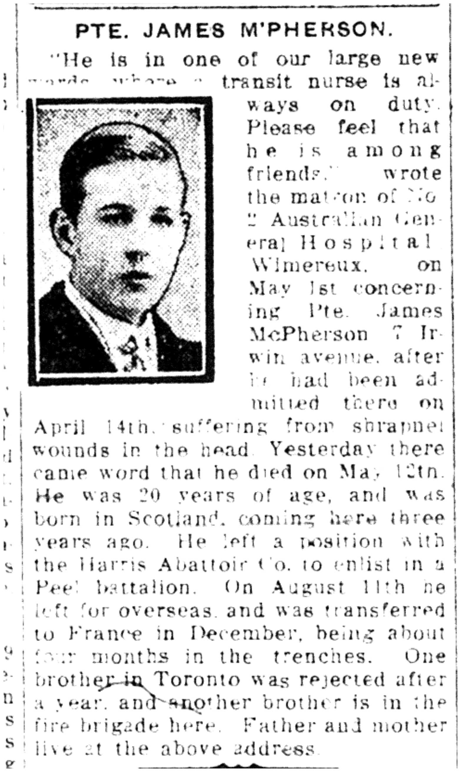 Son of James and Helen McPherson, of Toronto, Ontario.