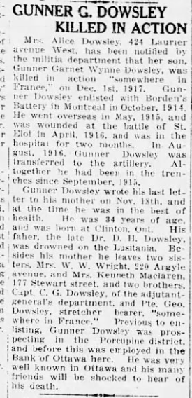 Son of Dr. David Henry and Gertrude Elizabeth Alice Dowsley, of Ottawa.