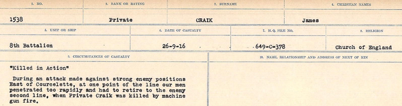 Son of James and Mary Craik; husband of Margaret Craik, of 20, Chief Fire Station, London Rd., Manchester.