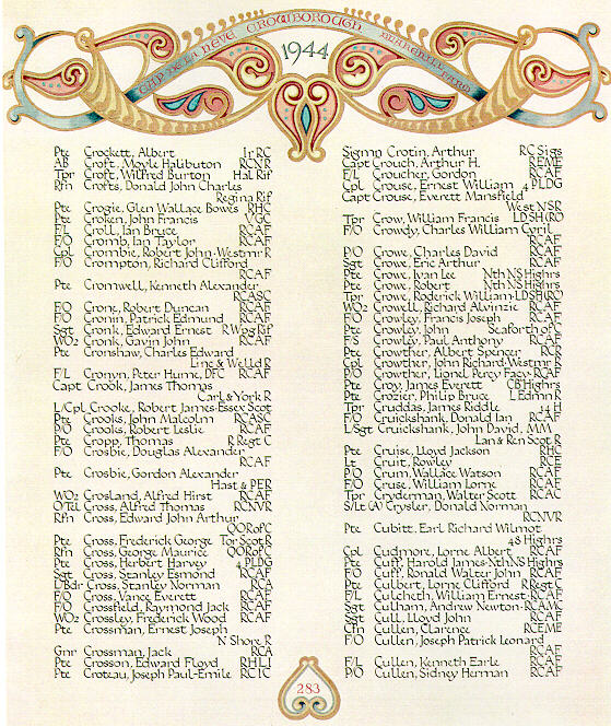 IN THIS CLOISTER ARE RECORDED THE NAMES OF TWENTY THOUSAND AIRMEN WHO HAVE NO KNOWN GRAVE. THEY DIED FOR FREEDOM IN RAID AND SORTIE OVER THE BRITISH ISLES AND THE LANDS AND SEAS OF NORTHERN AND WESTERN EUROPE