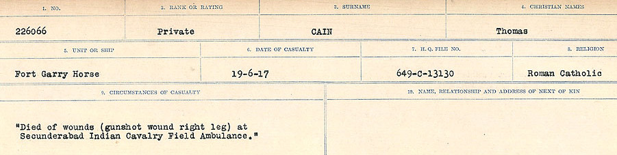 Son of Thomas Cain, of 24, Brookside St., Oswaldtwistle, Accrington, Lancs. Born at Great Harwood.