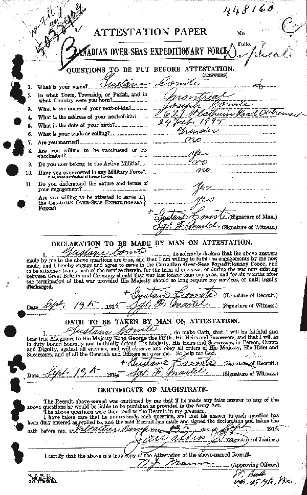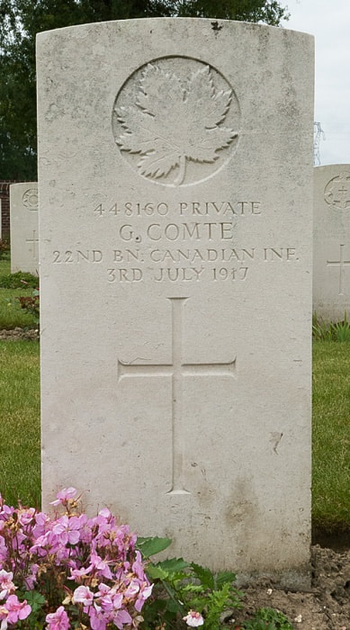 Enlisted in the 57th Battalion of the Canadian Expeditionary Force, he embarked with that unit for Great Britain, arriving in Liverpool on 8 June 1916. Assigned to the 69th Reserve Battalion, he was transferred to the 22nd Battalion on 27 August. Disembarking in France on the 28th, he took part in the Battle of Courcelette. From 6 April 1917 to 8 May 1917, he was illegally absent from duty and considered a deserter. Arrested on the 8th, he was court-martialed on 6 June 1917 and sentenced to death. He was shot on 3 July 1917 at Souchez, Pas-de-Calais.