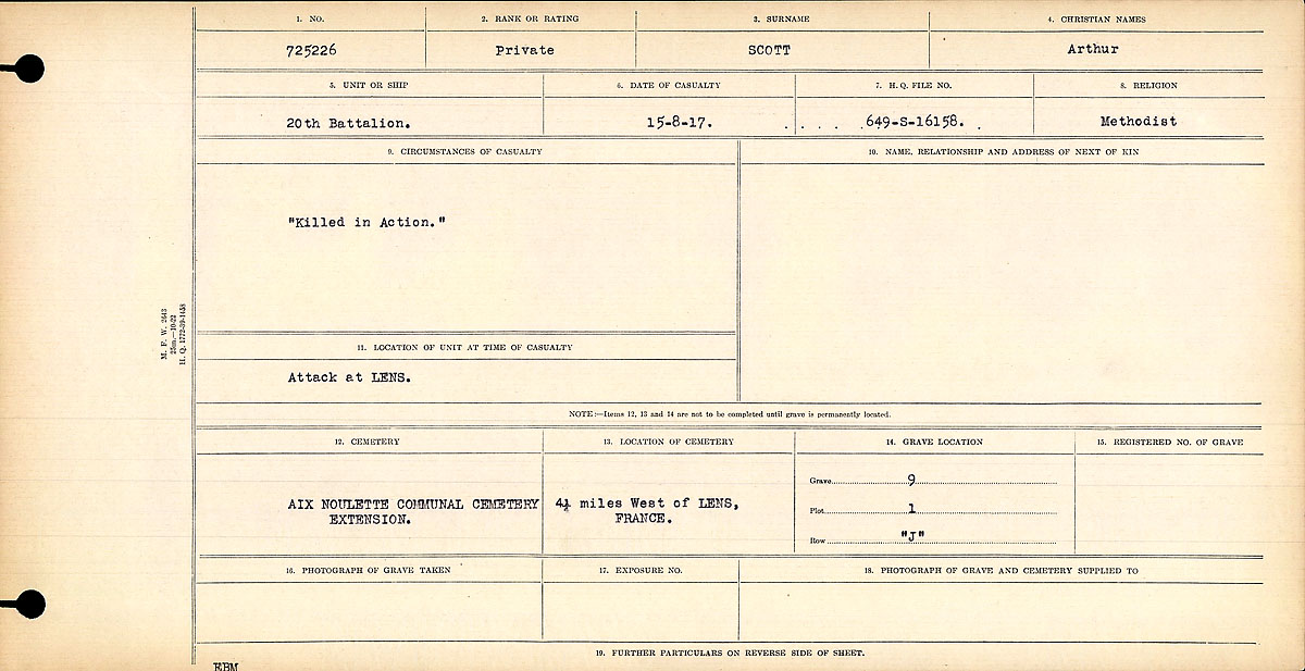 Aix-Noulette is a village in the Department of the Pas-de-Calais, about 13 kilometres south of Bethune on the main road to Arras. From Arras take the D937 towards Bethune. At Aix-Noulette, turn right at the church. The Communal Cemetery and Extension are a few hundred metres on the left side of the road to Bully-Grenay.