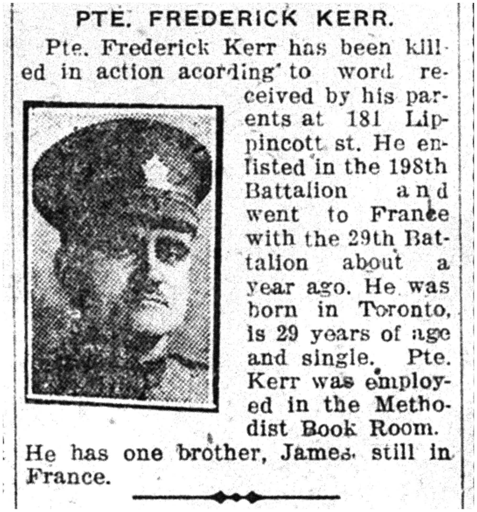 Son of Robert and Elizabeth Kerr, of 959, Dufferin St., Toronto, Ontario.