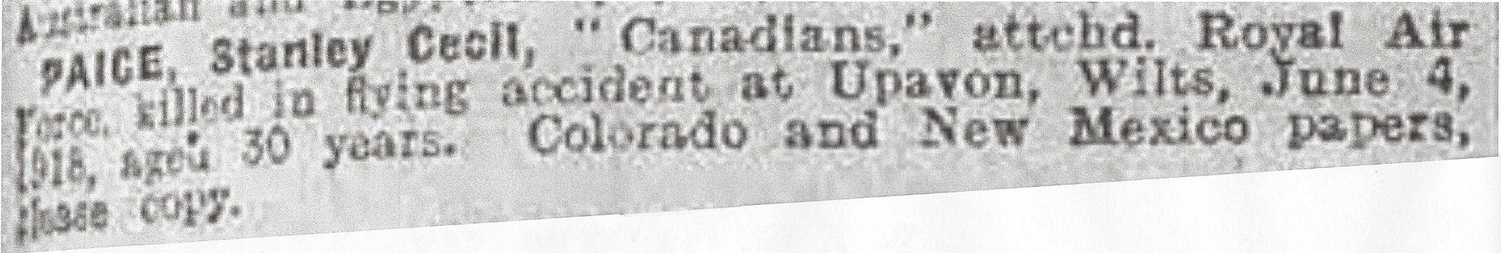 Son of George and Eunice Mary Paice, of Queen's Park, London. Enlisted at Kingston, Ontario, in "C" Battery Royal Canadian Horse Artillery. Born at Croydon, Surrey.