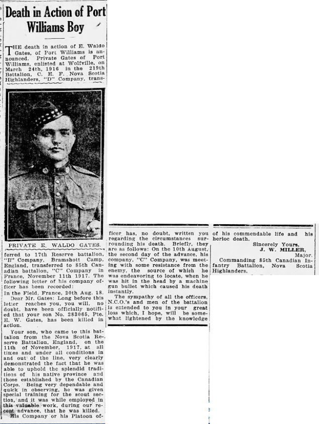 Son of Silas L. and Mary E. Gates, of Port Williams, King's Co., Nova Scotia. Private Gates enlisted with the 219th Battalion and trained at Aldershot. He sailed for England in October 1917 and spent two months trining at Bramshott, England. He arrived in France on December 16, 1917 and was transferred to the 85th Battalion. He fought for nine months in France. On August 10, 1918, two days after the Canadians launched their successful offensive near Amiens. Private Bates was doing scout" work when shot by a sniper. His parents would not learn of his death until after Labour Day, 1918.