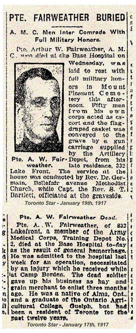 Son of William Fairweather, of Elora, Ont., and the late Mary Jane Fairweather; husband of Myrtle A. Fairweather, of 332, Lakefront, Balmy Beach, Toronto, Ont.