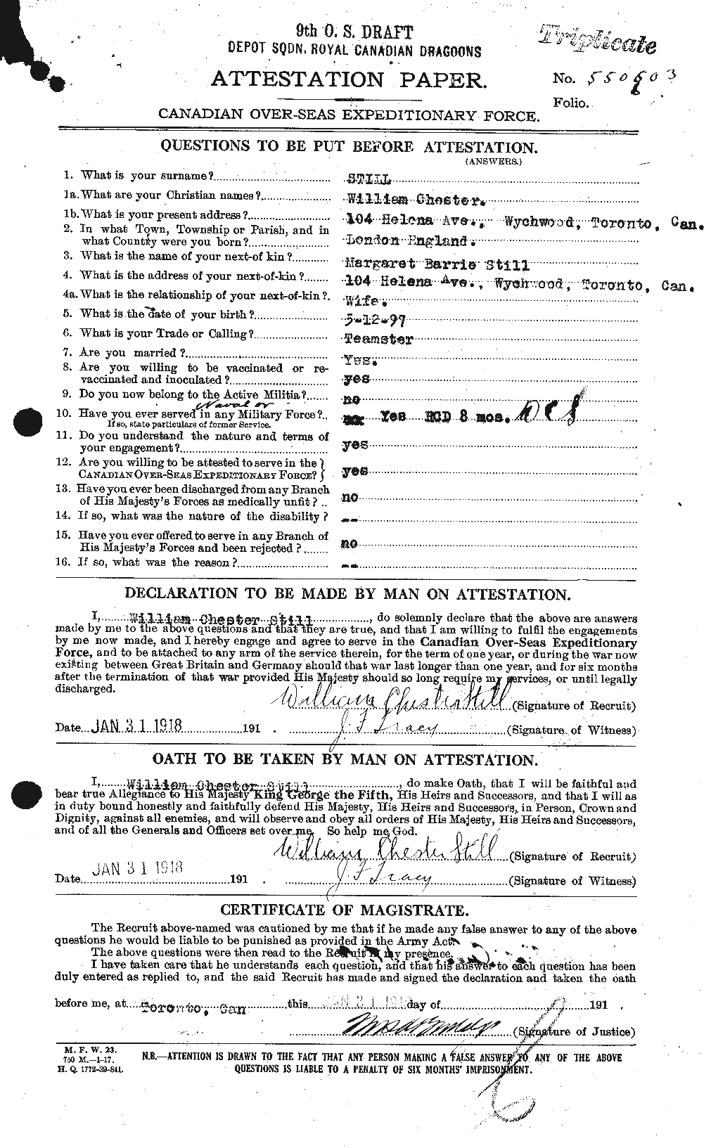 He enlisted twice, first as a Gunner, second enlistment as a Private. He was discharged as medically unfit on 26 September 1919 in Toronto, Ontario. He was buried by the Great War Veterans Association.