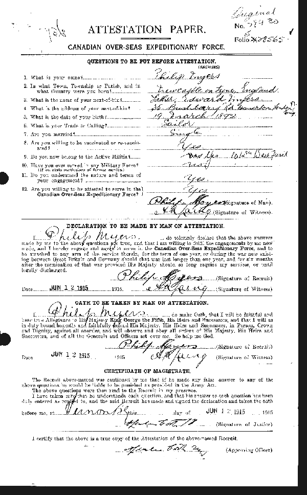 Son of Edward and Fanny Myers, of 35, Bushberry Rd., Homerton, London.