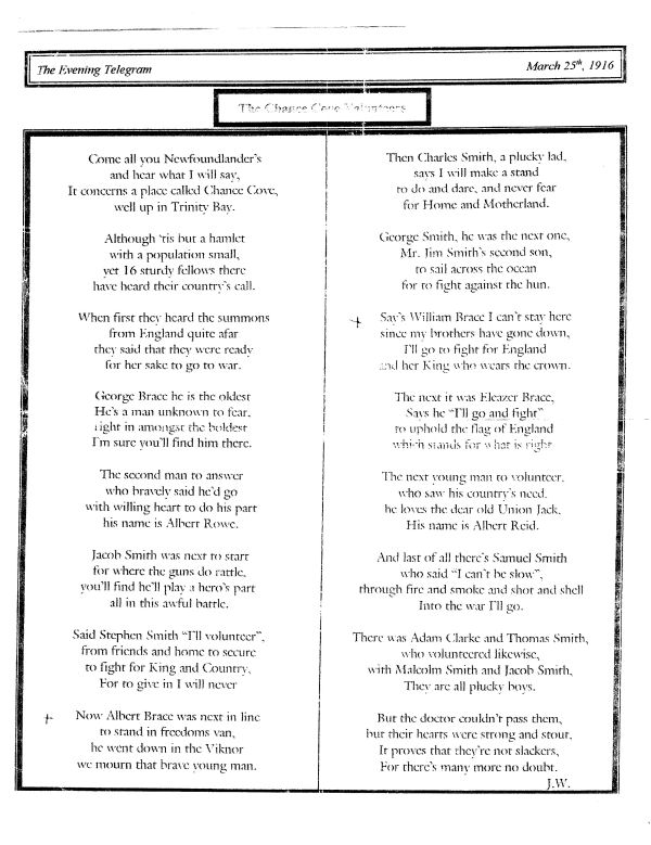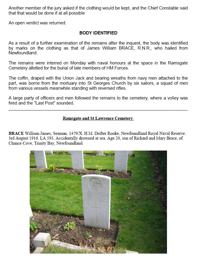 Son of Richard and Mary Brace, of Chance Cove, Trinity Bay, Newfoundland. Brother James Joseph and Seaman Albert Brace, Newfoundland Royal Naval Reserve, lost on the HMS Viknor on 13 January 1915.