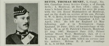 Son of Joseph and Elizabeth Betts of Montreal, Quebec. Husband of Margaret Betts. Father of Gordon and Armitage. He listed his occupation as Special Constable and Horseman. Brothers of Malcolm McFarland and Robert also served in the First World War.