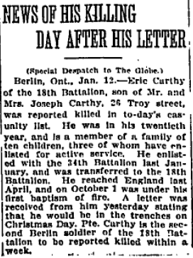 Son of Joseph and Harriet Carthy, of Kitchener, Ontario.