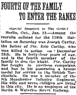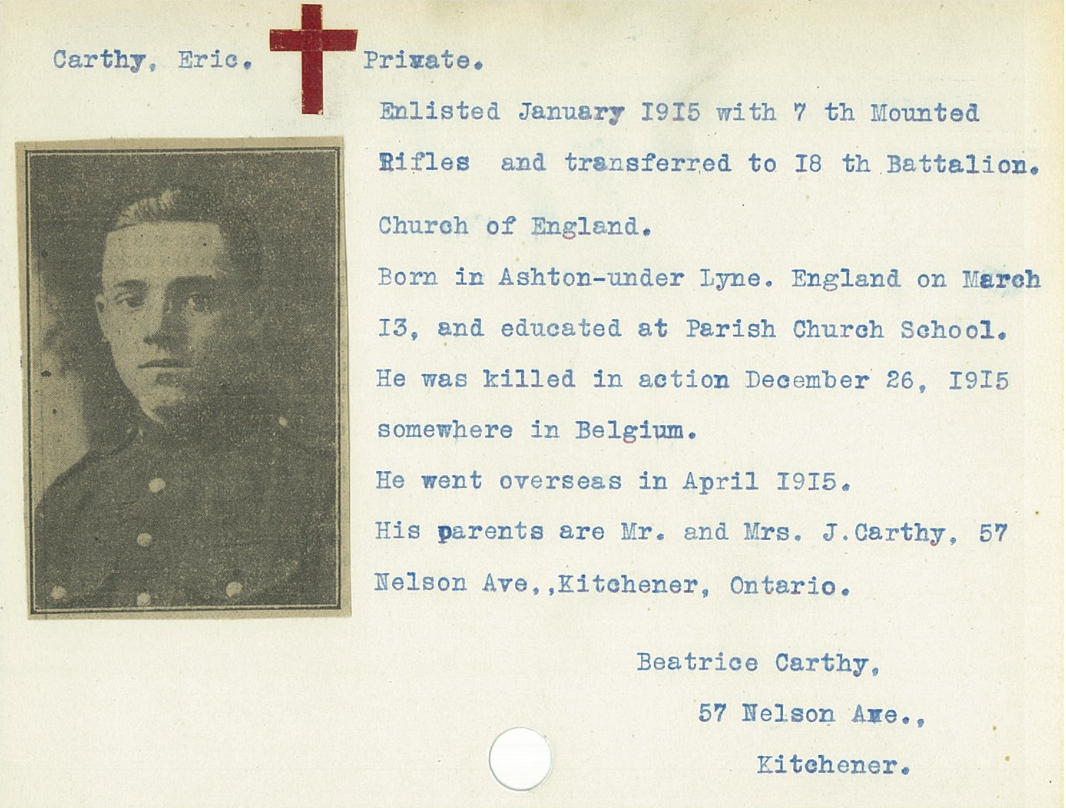 Brother of Private Percy Carthy, who died while serving with the Canadian Infantry (Western Ontario Regiment).