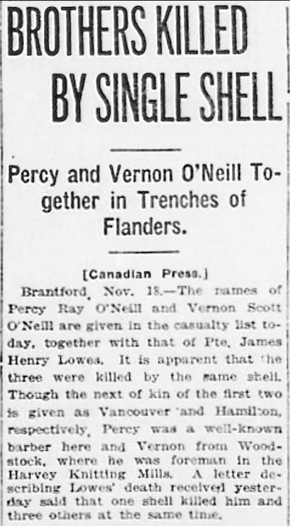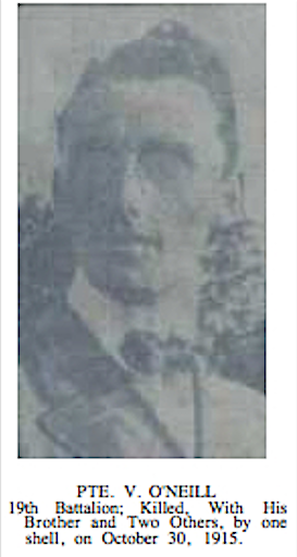 Brother of Eveline Scott of Hamilton, Ontario, Lizzie O'Neill of Vancouver, British Columbia and Private Percy Ray O'Neill, who was killed by the same shell while serving with the Canadian Infantry (Central Ontario Regiment). They are buried next to each other.