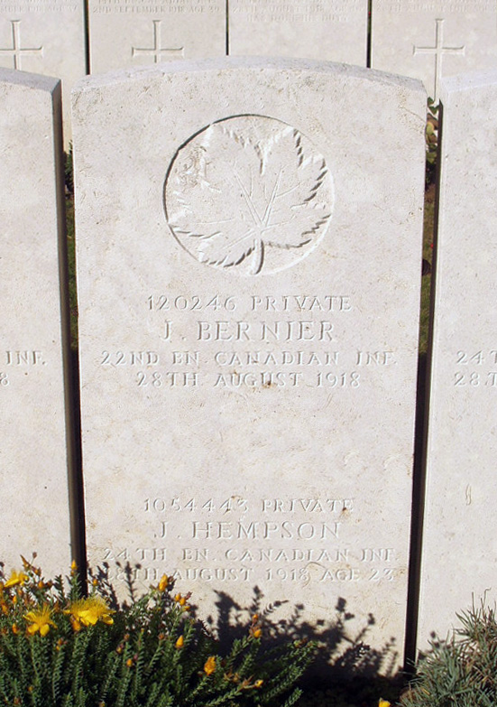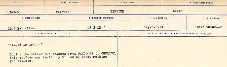 Baptized Joseph-Benoit Bernier. Son of Oscar-Damase Bernier and Virginie Miville-Deschênes, of Causapscal, Bas-St-Laurent, and Val-Barrette, Laurentides, Québec. He stated being born on 23 September 1894 when he enlisted.