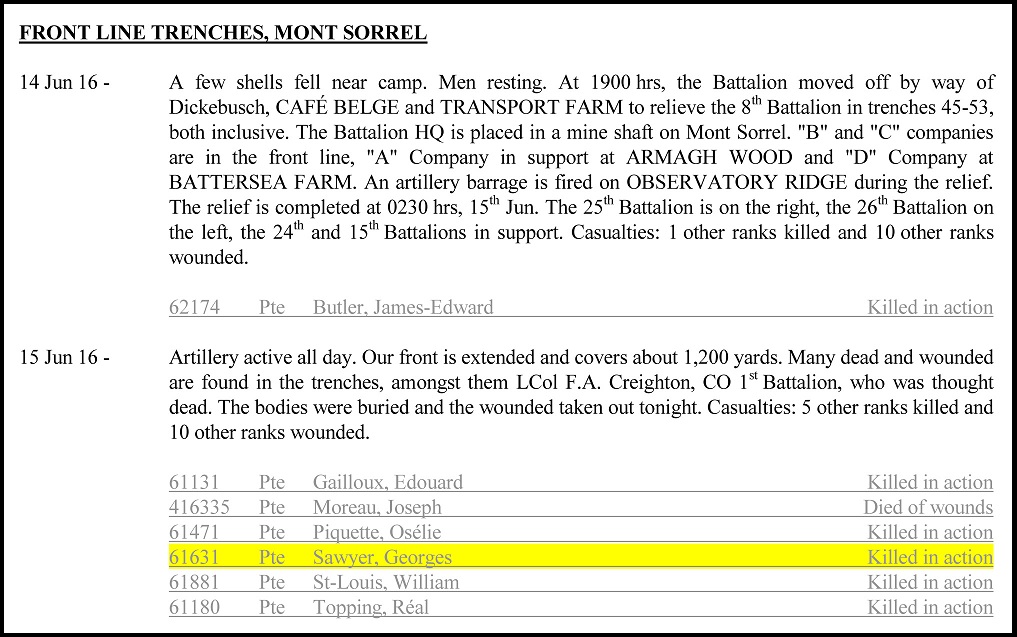 Death: June 15, 1916 Mont Sorrel, Belgium