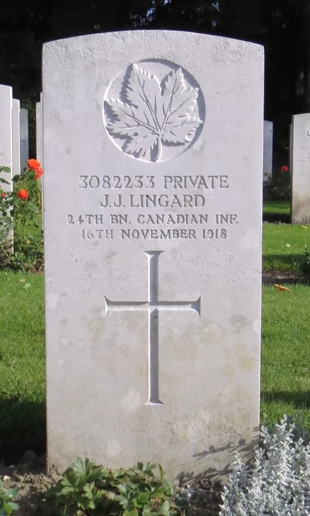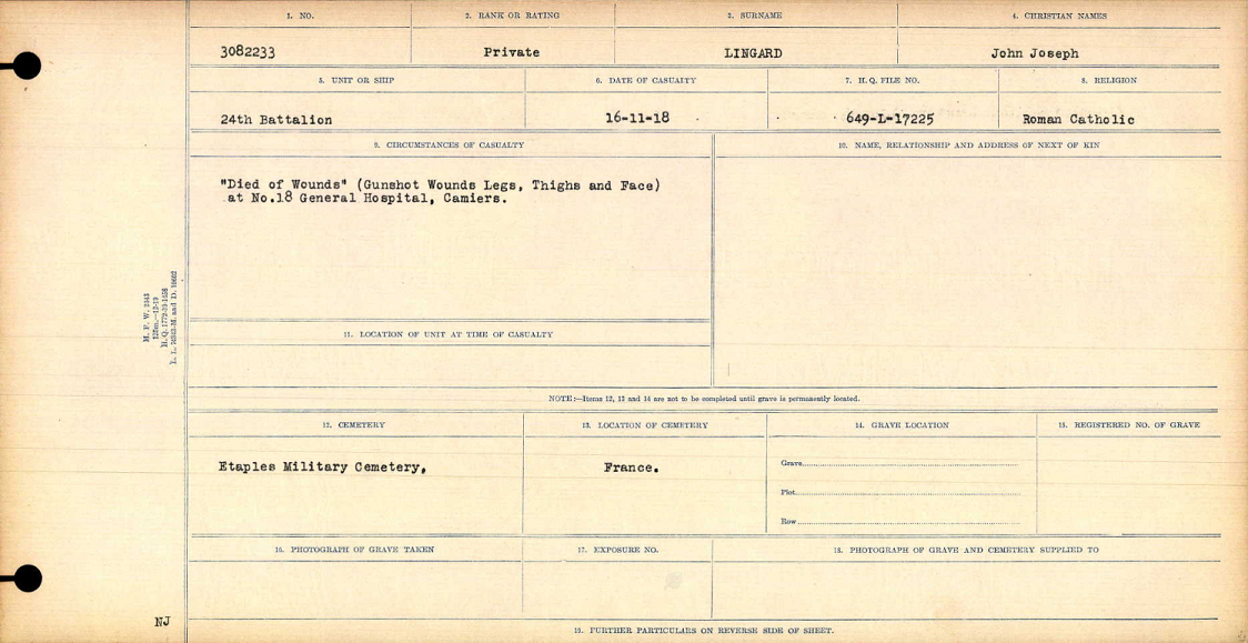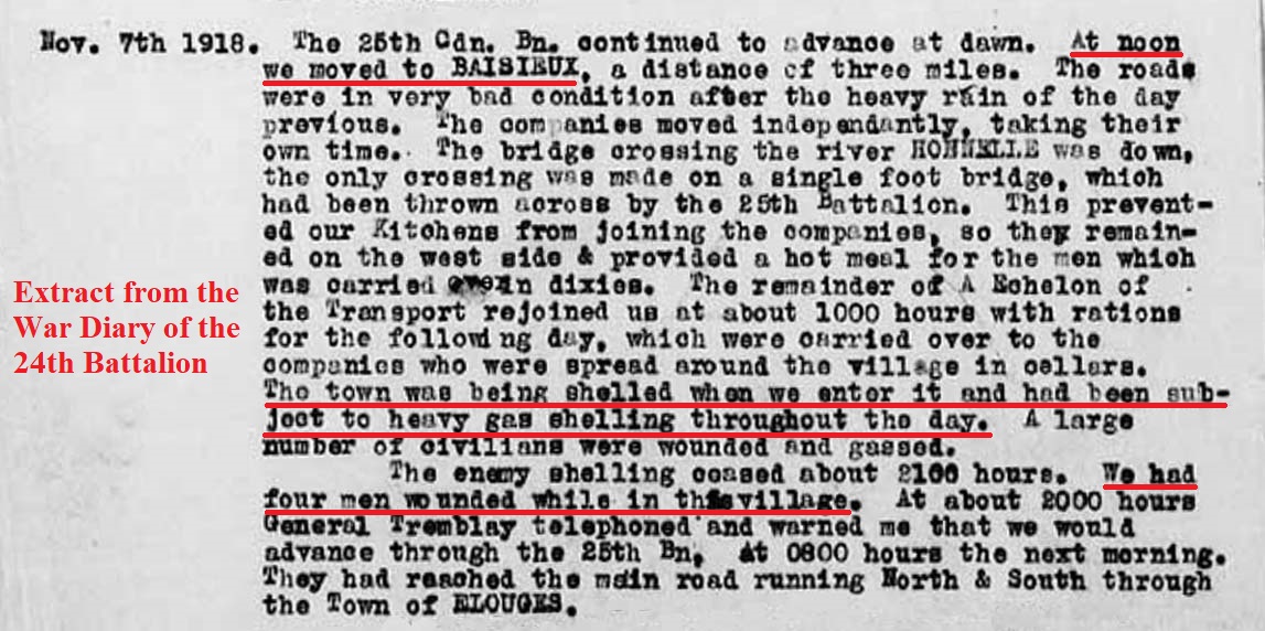 When he arrived in France he was sent as a reinforcement to the 22nd French Canadian Battalion but after a month and a half, possibly due to a language problem, he was transferred to the 24th Battalion, an English speaking unit.