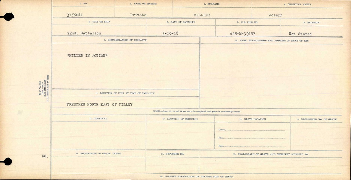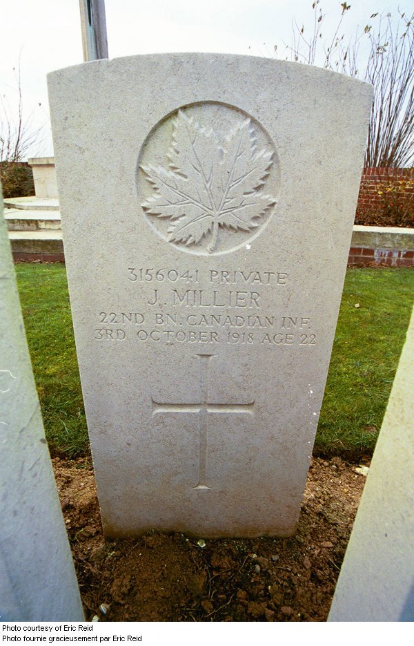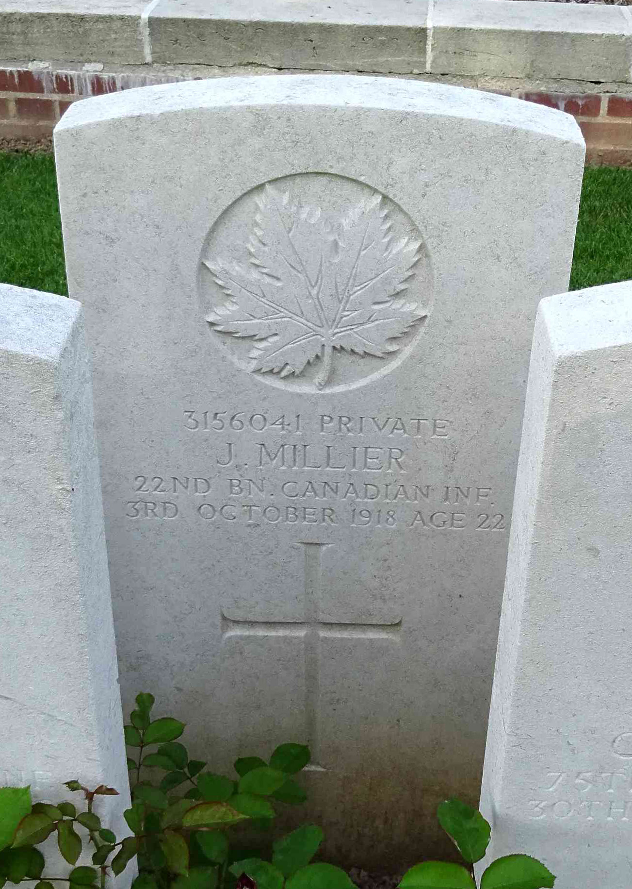 Tilloy was captured by the Canadian Corps about the 1st October, 1918, in the face of strong opposition, and the cemetery was made by their Burial Officer on the 13th October. It is enclosed by a brick wall, and sheltered from the road by a row of willows; and a maple tree is planted at the South-East corner.