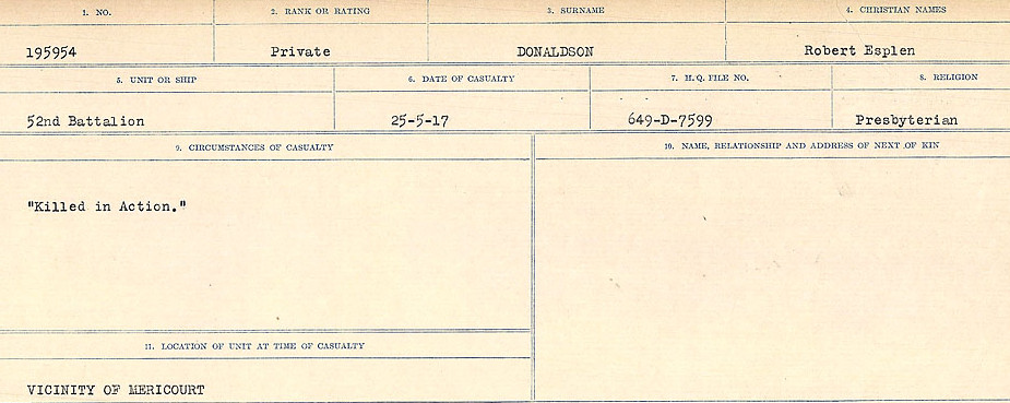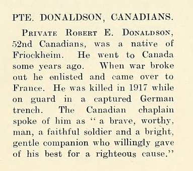 Son of James Donaldson; husband of Wilhelmina Donaldson, of Hamilton, Ontario. Served in the South African Campaign.