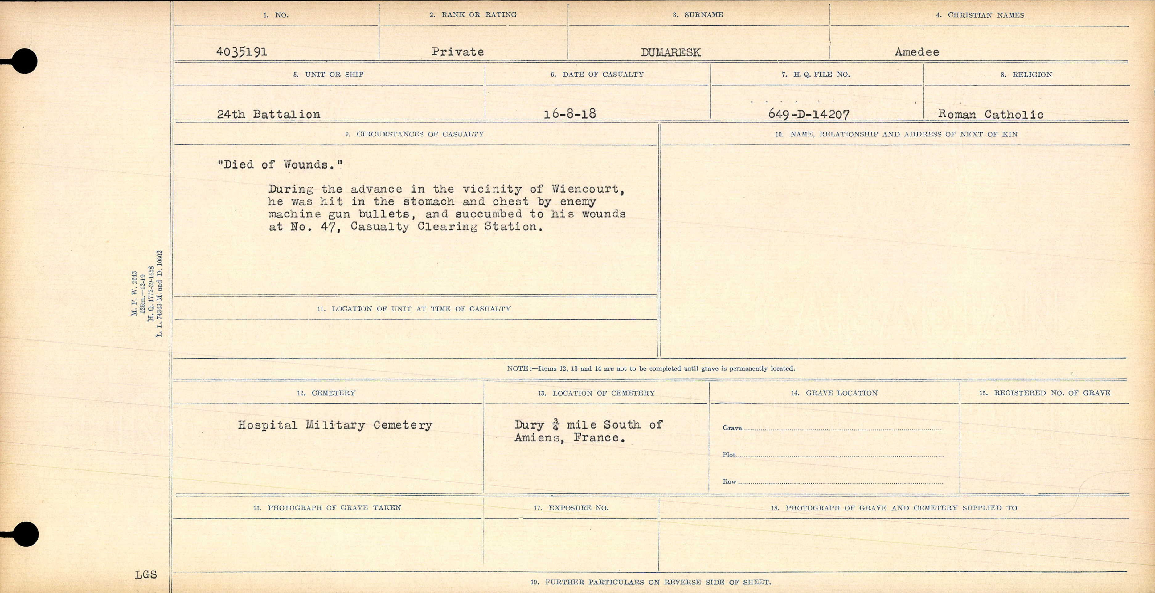 Son of Charles Dumaresq and his wife Alvine Element, of Fox River, Gaspe Co., Quebec.