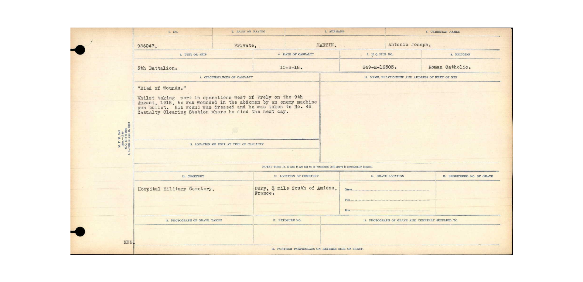 Villers-Bretonneux is a village 16 kilometres east of Amiens on the straight main road to St Quentin. The Villers-Bretonneux Military Cemetery is about 2 kilometres north of the village on the east side of the road to Fouilloy.
