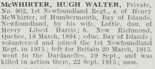 Son of Hugh Henry and Lottie McWhirter, of Humbermouth, Bay of Islands, Newfoundland. Pte McWhirter was the first member of The Royal Newfoundland Regiment to be killed in the First World War.