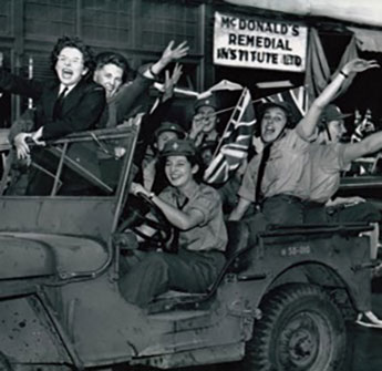The defeat of Germany was officially marked on May 8, 1945. People filled the streets in communities around the world to celebrate the end of fighting in Europe.