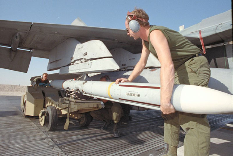 Canadian service member arming a CF-18 jet during the Gulf War.
