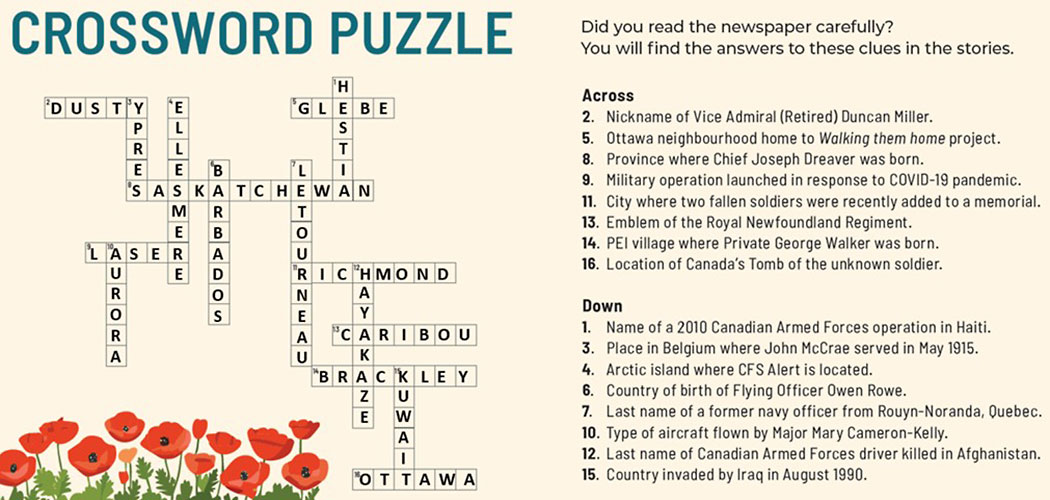 Learning Activities Introduction Exploring the Newspaper Time Line Remembrance 'Dog Tags' Be a Journalist Remembrance Sport Tournament Remembrance Play Wartime Collections And that’s the Rest of the Story Wartime Meals Librarians Know Best! Crossword Puzzle Answers Canada Remembers Times crossword puzzle