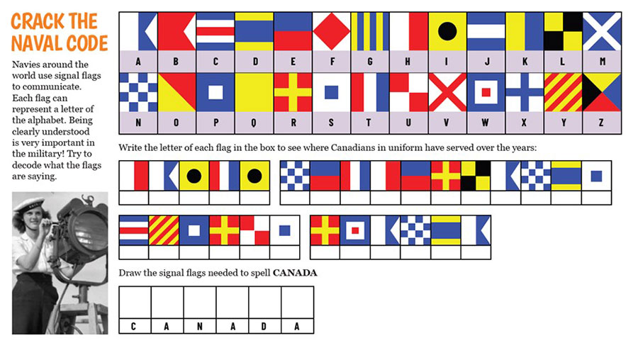Navies around the world use signal flags to communicate. Each flag can represent a letter of the alphabet. Being clearly understood is very important in the military! Try to decode what the flags are saying.