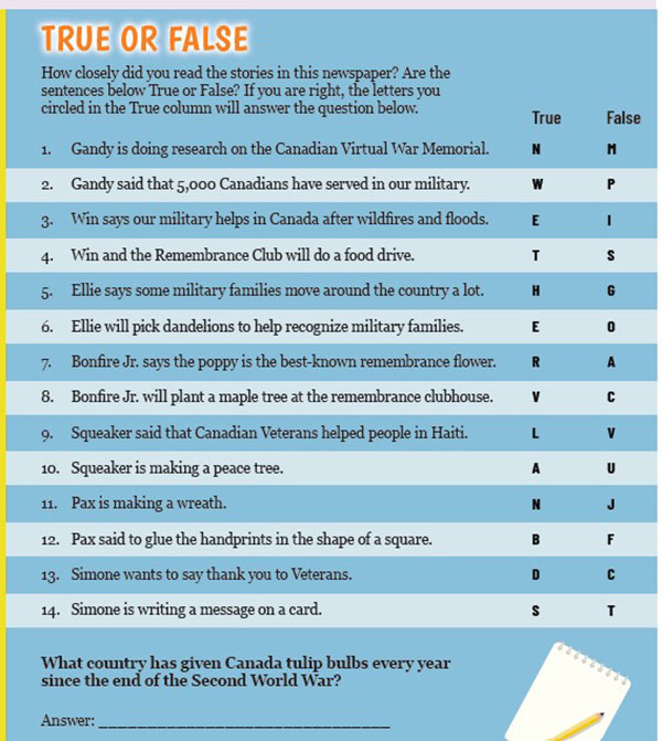 How closely did you read the stories in this newspaper? Are the sentence below True or False? If you are right, the letters you circled in the True column will answer the question below.