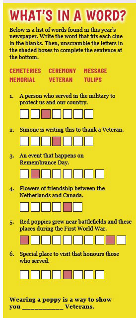 Below is a list of words found in this year's newspaper. Write the words that fits each clue in the blanks. Then, unscramble the letters in the shaded boxes to complete the sentence at the bottom.