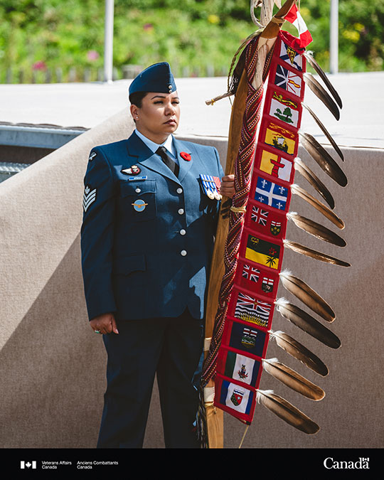 Image 1: An Indigenous Canadian Armed Forces member in a blue uniform stands and holds an Indigenous Eagle Staff. The Canada wordmark is in the bottom righthand corner.