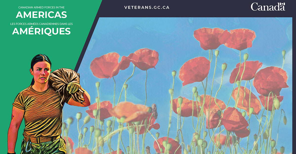 A woman Canadian Armed Forces member carrying a large sandbag on her shoulder blends with an image of poppies in a field. The bilingual text on the image reads: Canada’s Armed Forces in the Americas and Les Forces armées canadiennes dans les Amériques. The website address veterans.gc.ca is in the centre in white lettering on a black background. The Canada wordmark is in the top righthand corner.