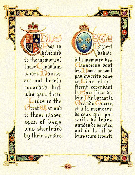 This page is dedicated to the memory of those Canadians whose names are not herein recorded, but who gave their lives in the Great War, and to those whose span of days was shortened by their service