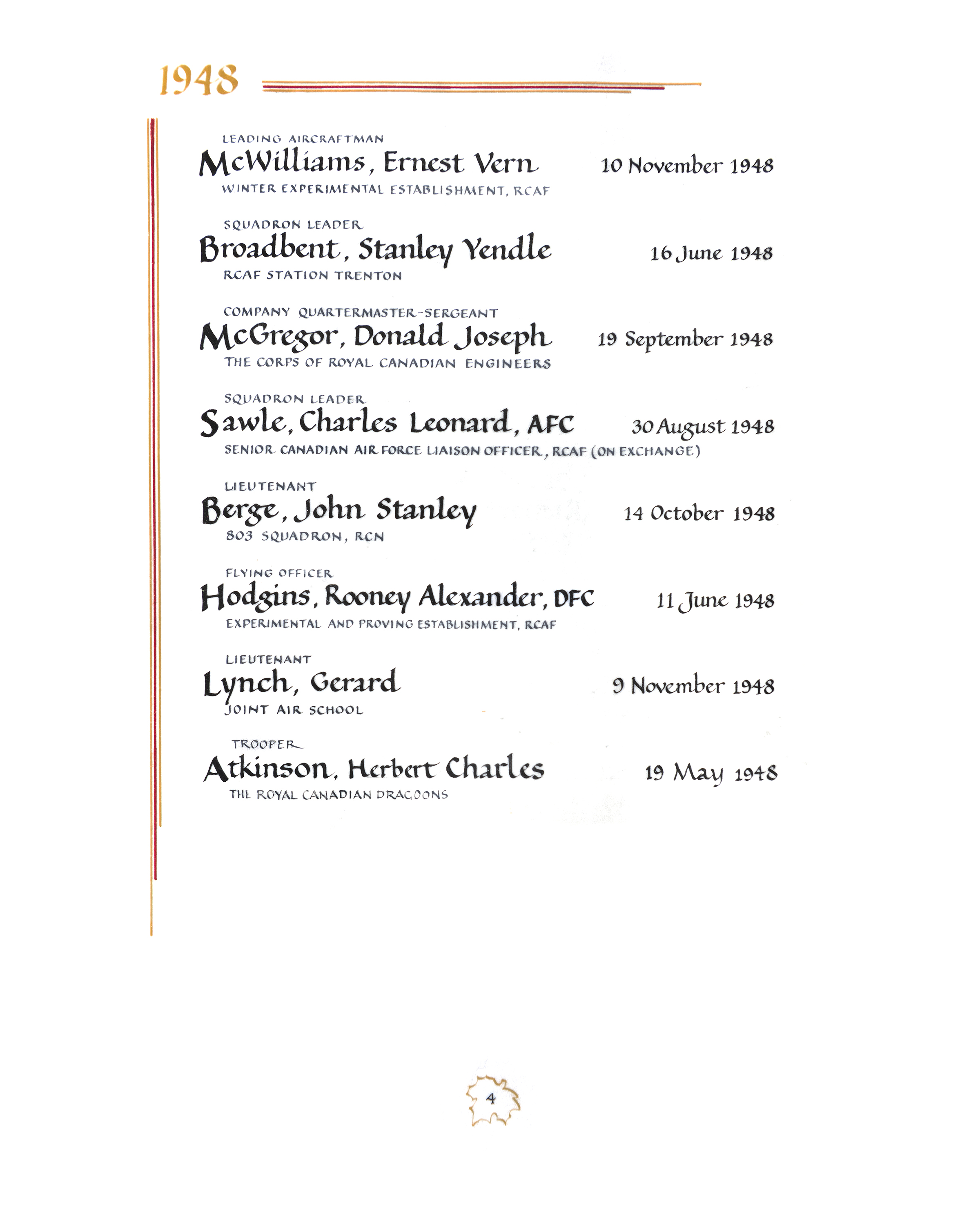 | 80002853 | Hodgins | Rooney Alexander | June 11, 1948 | Flying Officer | Experimental and Proving Establishment, RCAF |